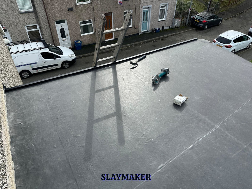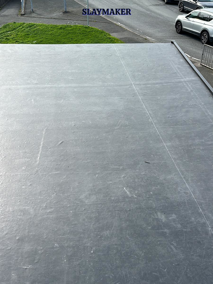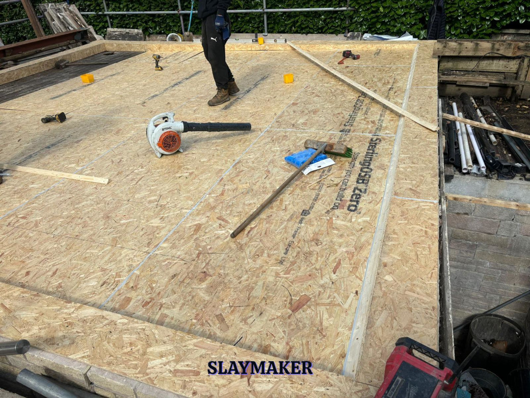 Removal of existing rotted decking and replacement with Oriented Strand Board (OSB) 18mm thick decking. Seal all joints and then bond a single sheet of EPDM Firestone Rubber surface membrane. Finally, install uPVC edge and drip drip trims.